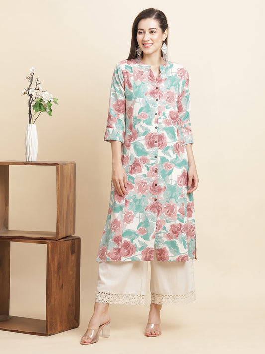 Pink printed Kurta with PalazzosKurta design: Floral printed A-line shape Regular style Mandarin collar, three-quarter...
