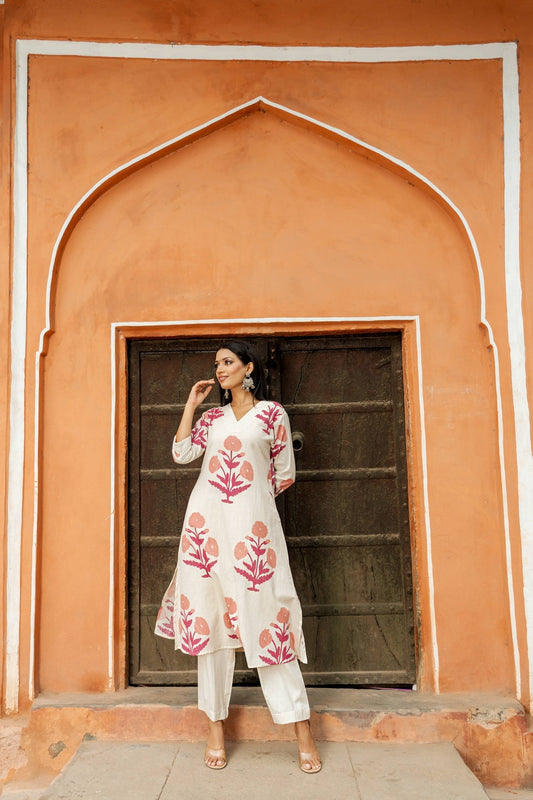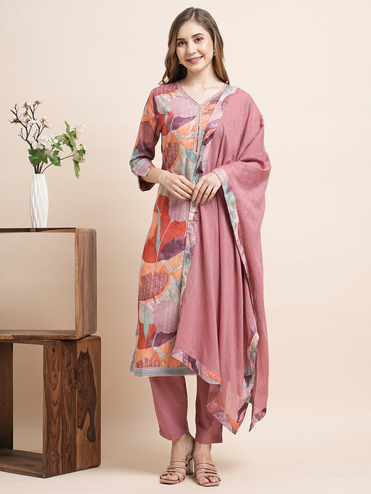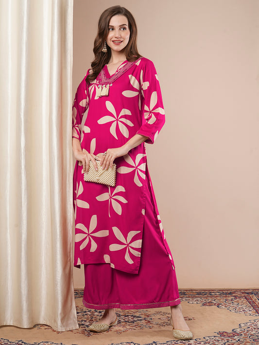 Pink printed Kurta with PalazzosKurta design: Floral printed Straight shape Regular style V-neck, three-quarter regular...