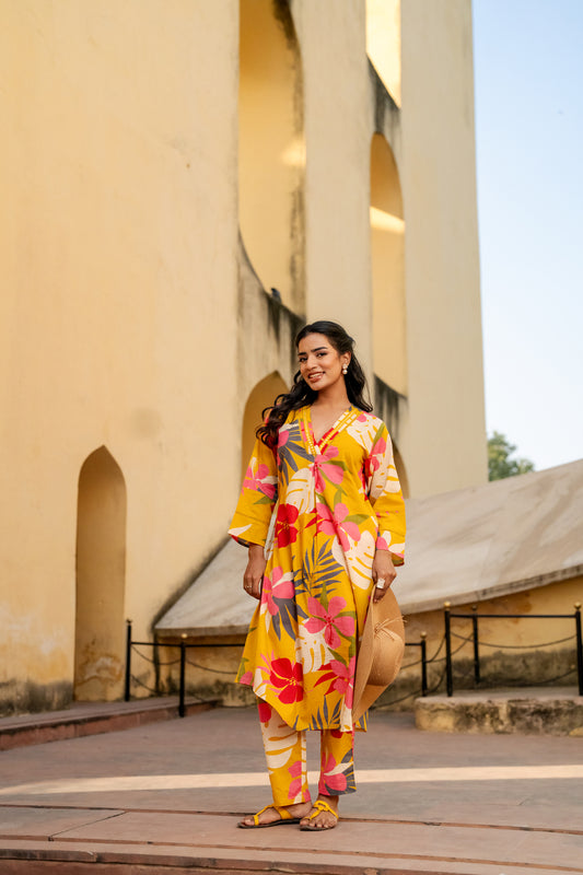 Yellow printed Kurta with TrousersKurta design: Floral printed A-line shape Regular style V-neck, three-quarter regular...