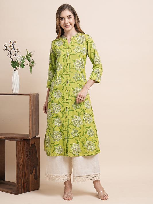 Green printed Kurta with PalazzosKurta design: Floral printed A-line shape Regular style Mandarin collar, three-quarter...