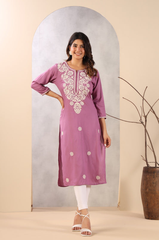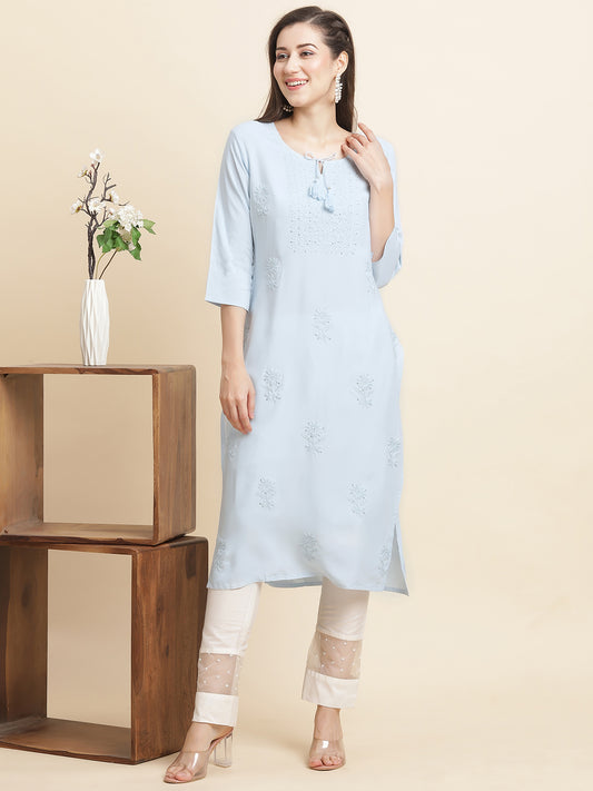 Solid EmbroideredStraight shapeRegular styleScoop neck, three-quarter regular sleevesThread work detailCalf length with straight hemViscose Rayon...