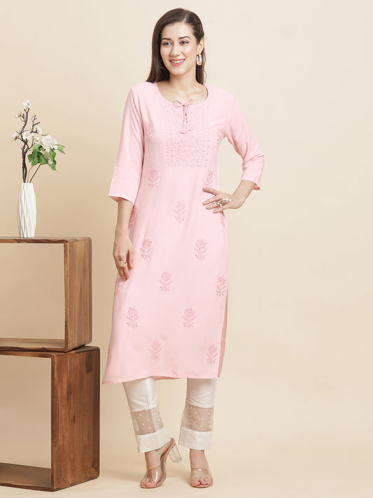 Colour: pink Floral embroidered Tie-Up Neck Three-Quarter Sleeves, regular sleeves Straight shape with regular...